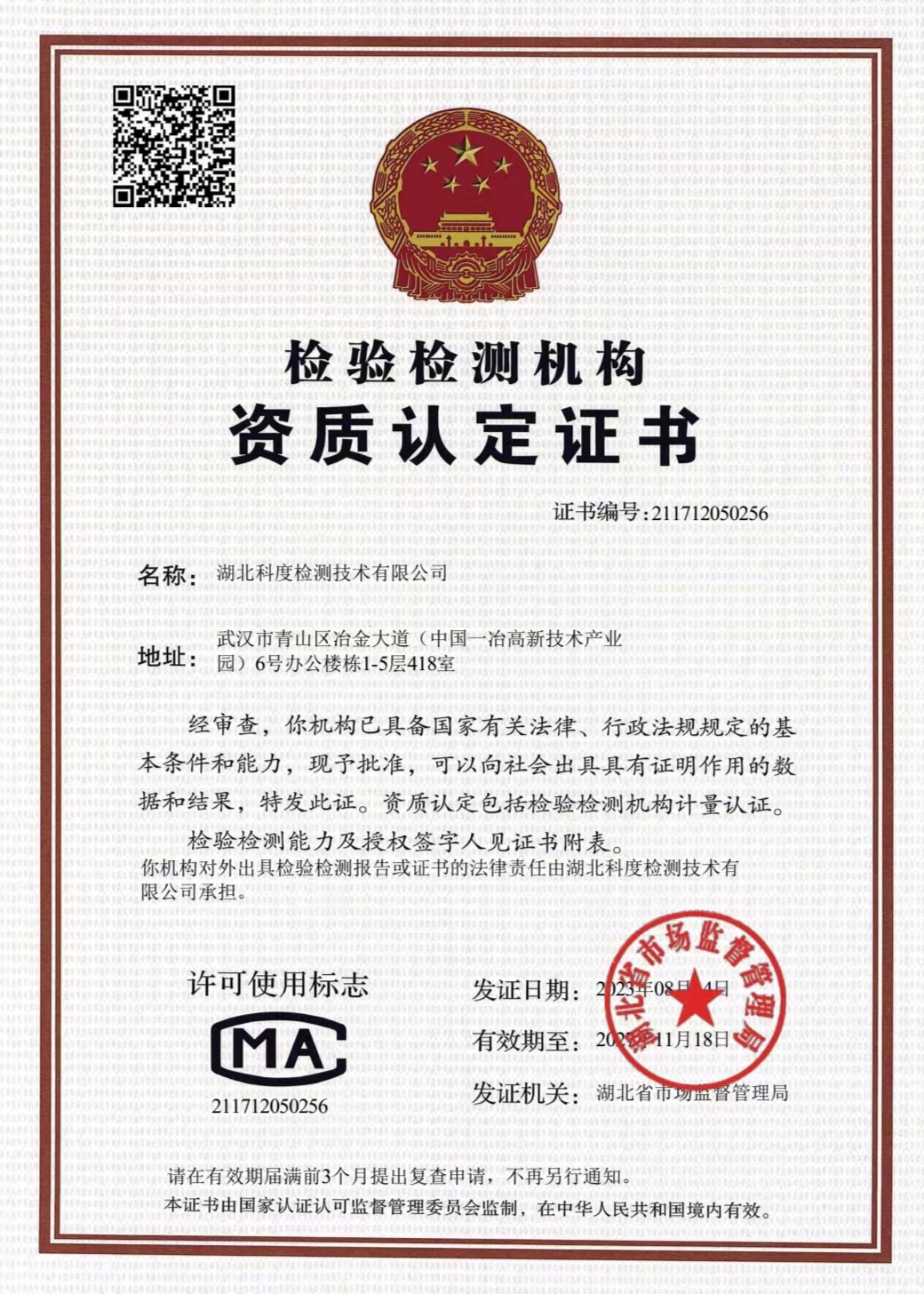 湖北科度檢測技術(shù)有限公司是一家專業(yè)從事環(huán)境類及相關(guān)領(lǐng)域檢測的第三方檢測機構(gòu),公司已通過湖北省市場監(jiān)督管理局CMA計量認證,可以面向社會出具權(quán)威CMA檢測報告。 我公司實驗室嚴格按照國家標準建設(shè),擁有一大批國內(nèi)外先進儀器設(shè)備及現(xiàn)代化配套設(shè)施,并有經(jīng)驗豐富的中高級專業(yè)技術(shù)人員和嚴格的實驗室質(zhì)量保證體系為項目運作提供強力支撐。 作為第三方檢測機構(gòu),公司始終以高度的社會責任感經(jīng)營企業(yè),以“公正、嚴謹、高效”為宗旨,依托專業(yè)的技術(shù)實力為客戶提供專業(yè)優(yōu)質(zhì)檢測服務,受到政府、企業(yè)和社會各界的廣泛關(guān)注和認可。